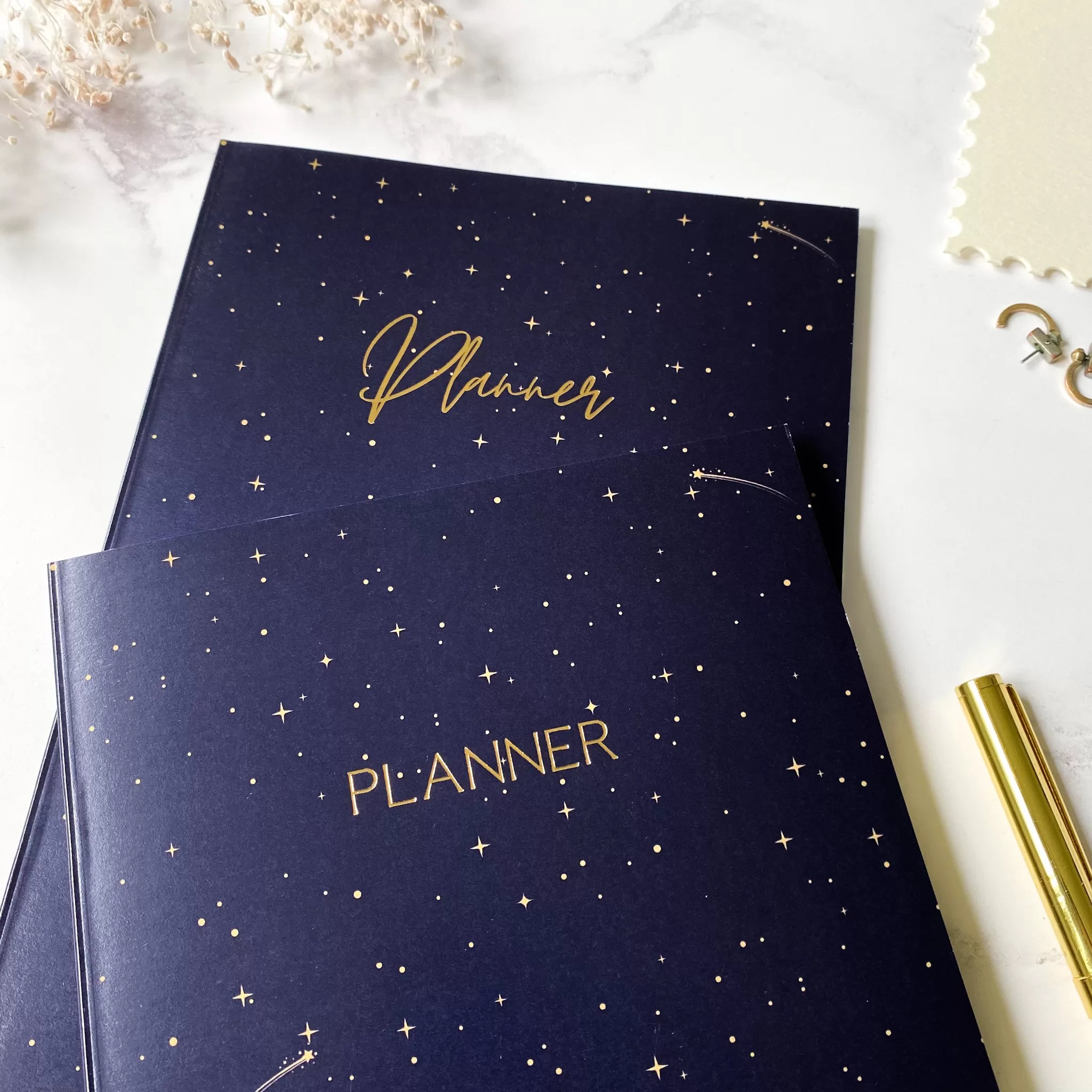 Our Navy Stars A5 daily planner notebook is in our signature deep navy colour. The planners are undated and come with gold ‘Planner’ text, in a choice of two font styles. Add optional personalisation at the bottom of the cover.