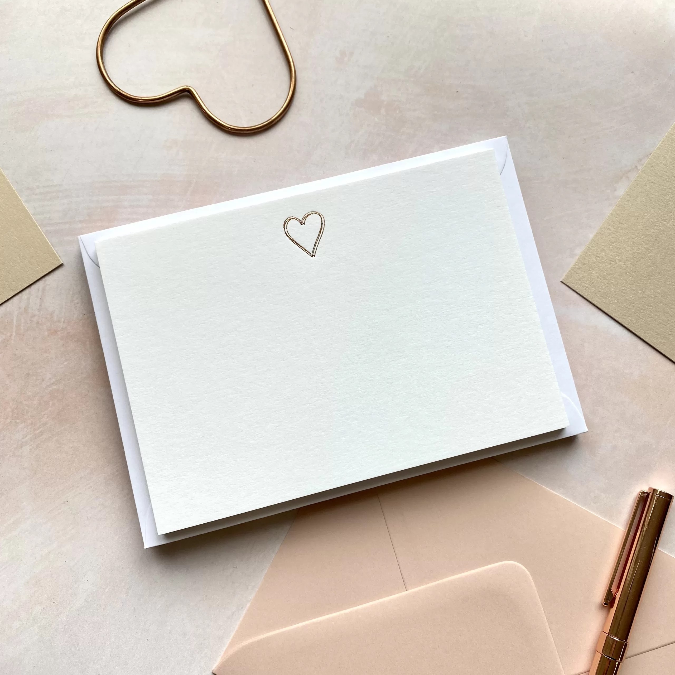 A6 Notecard & envelope set, with heart design foil printed centrally at the top of the notecards. Each notecard is individually printed by hand in our London studio, on luxurious 350gsm card.